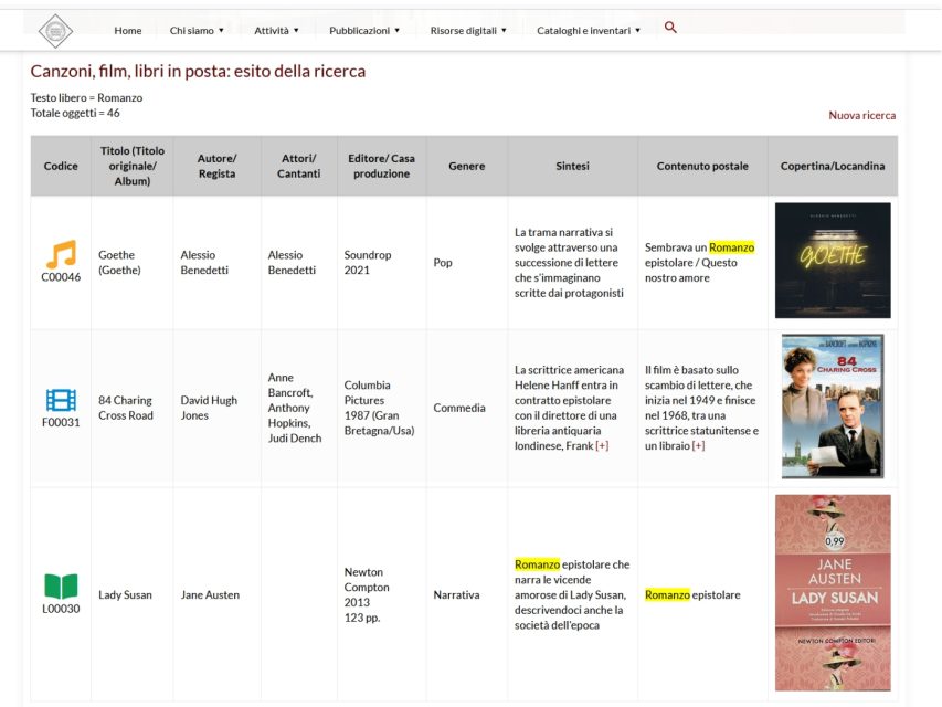 Ad esso hanno lavorato alcuni volontari, inserendo i dati di 92 canzoni (questa parte è dovuta a Beniamino Bordoni), 41 film (Claudio Baccarin) e 150 libri (Federica Rustichelli), giunti sul mercato italiano e che citano in maniera sostanziale la posta o il mondo dei francobolli. Coordinati da Fabio Bonacina, e per la parte tecnica da Giorgio Chianetta, dettagliano secondo i casi titolo, autore, anno di produzione, genere e altre informazioni, cui si aggiungono una sintesi dell’opera e l’eventuale citazione che interessa il settore. Spaziando dai brani “Angeli e fragole” e “Accidenti a quella sera”, alle pellicole “Decalogo, 10” e “Totò, Peppino e la… malafemmina”, ai volumi “Il postino di Neruda” e “Memorie di Adriano”.